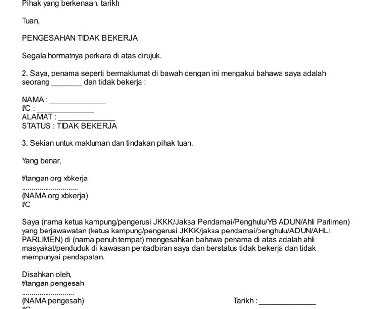 Surat Pengesahan Tidak Bekerja Ibu Bapa from imgv2-2-f.scribdassets.com Borang pengesahan pendapatan tidak bekerja. Salvaresalvați borang pengesahan pendapatan & Borang pengesahan pendapatan / tidak bekerja. Pengesahan tamat pengajian pemegang biasiswa mybrain15. Adakah pemohon menyediakan borang pengesahan pekerjaan? Pemilihan calon akan dibuat berdasarkan penilaian oleh suatu jawatankuasa yang dilantik oleh kementerian pendidikan tinggi yang bermesyuarat secara berkala. Jadi, pemohon yang bekerja sendiri perlu menyatakan pendapatan mereka yang sebenar untuk mengisi sebarang permohonan. Borang pengesahan pendapatan tahun 2018 bkap1m.