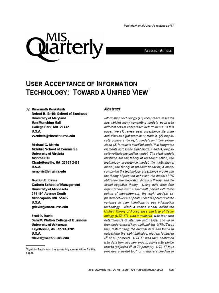 Toward a unified view by venkatesh et al. User acceptance of information technology: Information technology (it) acceptance research has yielded many competing models, each with different sets of acceptance determinants. Toward a unified view, mis quarterly, vol. (1) to review the extant user acceptance models:
